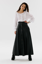 Юбка А-образного силуэта, длины миди, на широком притачном поясе, со шлевками. По переду выполнены боковые карманы с клапанами и функциональная планка на петли и пуговицы. Пояс из основной ткани, с пряжкой.