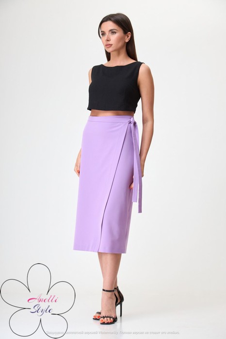 Юбка с элементом запаха, на притачном поясе. Выполнена из костюмной ткани в чёрном цвете, без подкладки. В новейших моделях запах располагается спереди сбоку. Это формирует изящный вырез треугольной формы, который смотрится очень женственно.