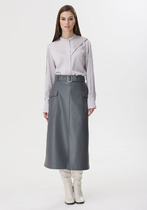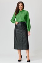 Прямой силуэт, притачной пояс с элементами отделки. Застёжка по переду по всей длине юбки на металлической разъемной молнии.