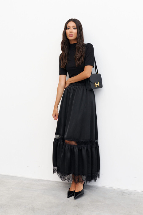 Юбка свободного кроя с акцентным черным кружевом выполнена из струящегося полотна. Характеристики: свободный крой, пояс на резинке, по юбке вставка из ажурного кружева, по низу изделия нашито ажурное кружево. Длина 101 см.