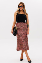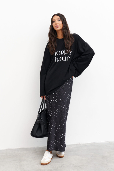 Стильная юбка полуприлегающего силуэта выполнена из струящегося полотна черного цвета в горох. Характеристики: полуприлегающий силуэт, пояс на ожурной резинке. Длина по боковому шву 96 см.