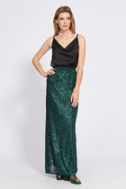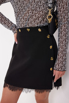Юбка прямого кроя, выполнена из текстильного полотна. Характеристики: прямой крой, в боковых швах карманы, стабильный пояс, застежка потайная на крючки и молнию. Сзади изделия нашиты декоративные карманы. По низу изделия пришита дополнительная ткань голубого цвета, в белую полоску. Длина по боковому шву 40см