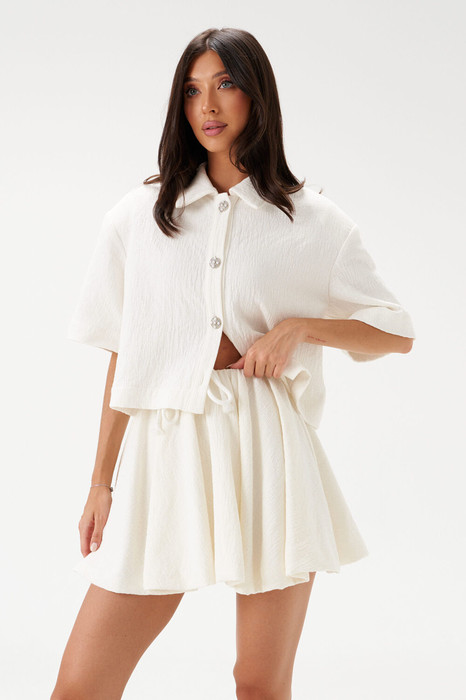 Юбка - баллон, выполнена из текстильной ткани молочного цвета. На хлопковом подкладе.Расширенная к низу. Пояс на резинке со шнурком-завязкой. Длина 40 см