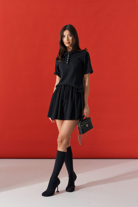 Юбка-мини свободного кроя. Выполнена из плотного трикотажа чёрного цвета. Без подкладки. Пояс не резинке со шнурком. Без застёжки. В боковых швах карманы. Длина юбки по боковому шву 38,5 см