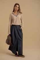 Юбка из пайеток, длинная, по талии с кантом из атласа, по низу сетка. По спинке юбка вытачки и центральный шов, вверху которого застежка на тесьму-молнию, а по низу обработан разрез. Юбка на подкладке из атласной ткани.