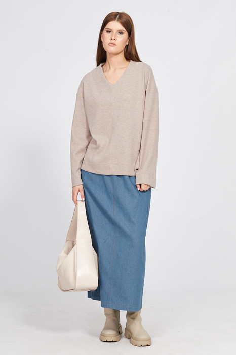 Юбка выполнена из джинса. Юбка прямого силуэта, на цельнокроенном поясе с эластичной тесьмой, длиной миди. Спереди средний шов и прорезные карманы с листочкой. Сзади средний шов с разрезом. По поясу спереди люверсы и втянута "шляпная" тесьма с фиксатором.