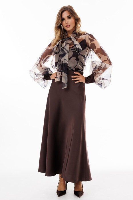 Юбка выполнена из плотного атласа. Юбка расширенная к низу, на притачном поясе, длиной миди.Переднее и заднее полотнища цельные и выкроены по косой. Застежка в левом боковом шве на потайную молнию и пуговицу. Юбка без подкладки.