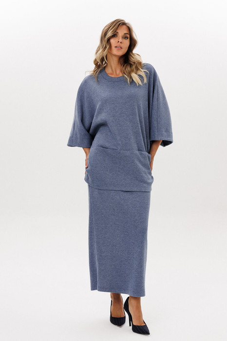 Юбка выполнена из трикотажного полотна. Юбка прямого силуэта, длиной миди, на цельнокроенном поясе с эластичной тесьмой. Сзади разрез в среднем шве.