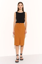 Юбка слегка зауженная к низу, на широком поясе, эластичном в области спинки, с наклонными боковыми карманами, застежкой и шлицей по центру передних половинок. Длина юбки в р.46-48 около 55 см, в р.50-52 около 58 см.