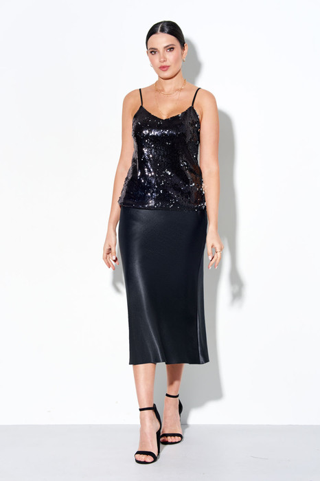 Юбка миди прилегающего силуэта из струящейся сатиновой ткани с добавлением шелка; пояс притачной, в боковые швы которого вставлена резинка для лучшего прилегания; застежка на молнию, петлю и пуговицу.