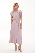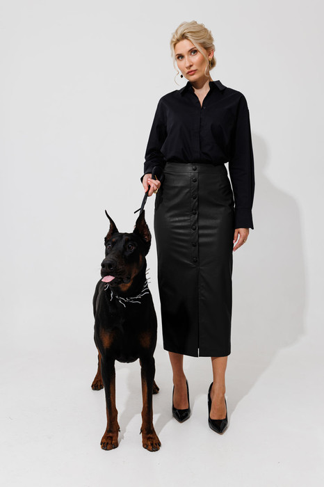 Кожанная юбка длины миди. По переду выполнена планка с пуговицыми заканчивающаяся разрезом. Зстежка в боковом на потайную молнию. По заднему полотнищу расположен разрез. Ее можно сочетать с рубашками, гольфом в обтяжку и уютными осенними свитерами. Материал очень практичный в носке.