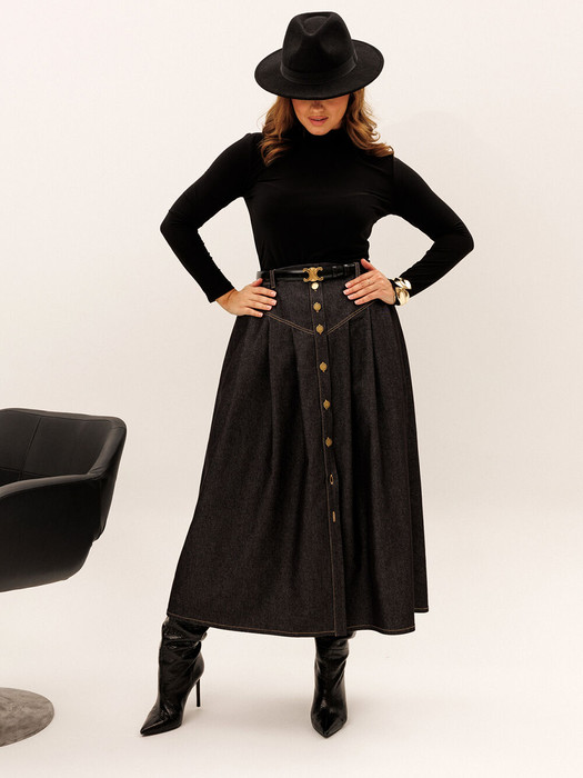Юбка выполнена из джинсовой ткани. По переду и спинке отрезная кокетка. На нижней части юбки по шву притачивания кокетки заложены односторонние складки. Верх юбки на притачном поясе со шлёвками, по бокам вставлена эластичная тесьма. В боковых швах карманы. Застёжка центральная на петли и пуговицы.
