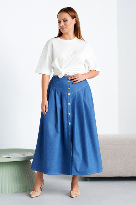 Юбка выполнена из джинсовой ткани. По переду и спинке отрезная кокетка. На нижней части юбки по шву притачивания кокетки заложены односторонние складки. Верх юбки на притачном поясе со шлёвками, по бокам вставлена эластичная тесьма. В боковых швах карманы. Застёжка центральная на петли и пуговицы.