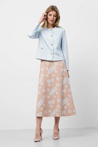 Юбка карандаш средней посадки с отрезным поясом  выполнена из  ажура  с вишивкой на сетке, в качестве подкладки костюмная ткань с матовым блеском.  Застежка на потайную молнию в среднем шве спинки, по низу разрез.