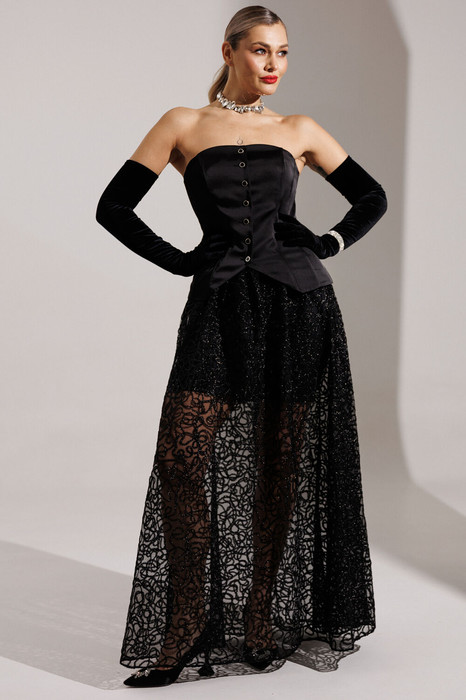 Хотите образ, который соберет все восторженные взгляды? Не ищите дальше! Встречайте главную героиню новогодней ночи! Юбка, которая состоит из двух слоев: нижняя часть зауженная мини, а верхняя — длинная, пышная. Верхний слой выполнен из черной сетки, расшитой декоративной тесьмой.  Притачной пояс и молния сзади завершают образ. Вы выглядите безупречно и чувствуете себя уверенно в любом движении! Завершите образ с помощью корсета из нашей новогодней коллекции. В дуэте они раскрываются на все 100%: баланс пышности низа и собранного верха. Ваш готовый билет на самый стильный Новый год!
