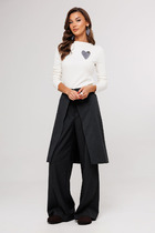 Элегантная юбка прямого силуэта длиной миди с разрезами на переднем и заднем полотнищах. Переднее полотнище с частичным запахом, имитацией боковых карманов с отрезным бочком. Заднее полотнище со средним швом, отрезной кокеткой, накладными карманами. Пояс притачной.