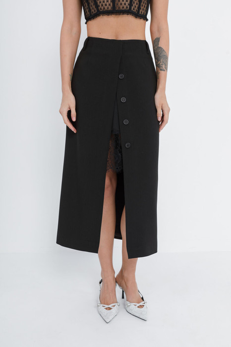 Детали: высокая посадка, талиевые вытачки, перед с застежкой на потайные петли и пуговицы, нижняя юбка с широким притачным кружевом, шлевки, спинка с застежкой на потайную молнию, на подкладке.