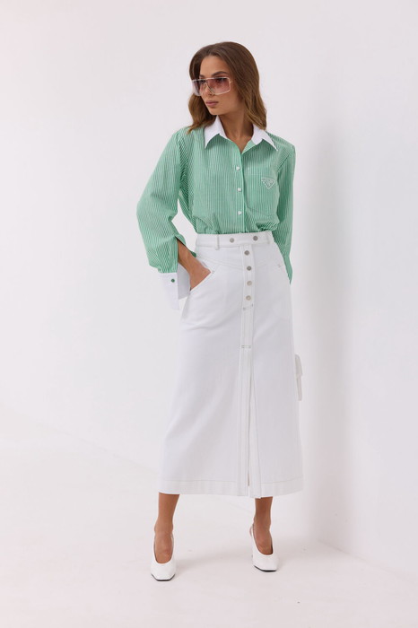 Юбка миди из джинсовой ткани. Верх на поясе со шлевками. Застежка по переду на кнопки. В боковых швах карманы. По переду кокетка и планка, переходящая в разрез. По спинке кокетка и карманы с клапаном. На клапане застежка на кнопку. Сзади на поясе нашивка.
