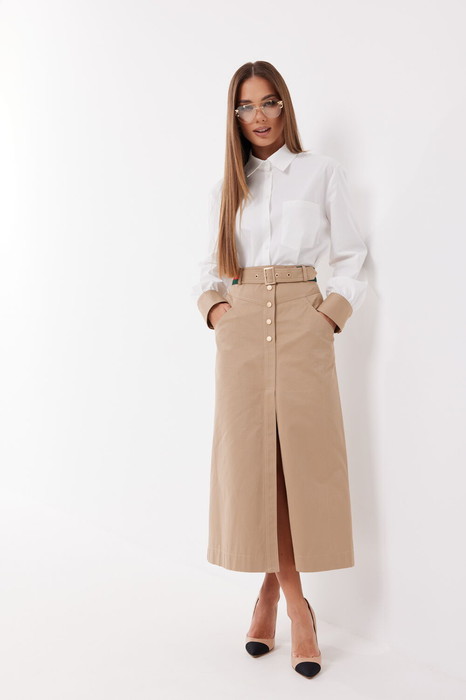 Юбка миди. Верх на поясе со шлёвками. Застёжка по переду на кнопки. По переду кокетка и планка. Боковые карманы с часовым карманом. По спинке кокетка и карманы с клапаном . На клапане застёжка на кнопку. Съёмный регулируемый пояс-резинка на пряжке.