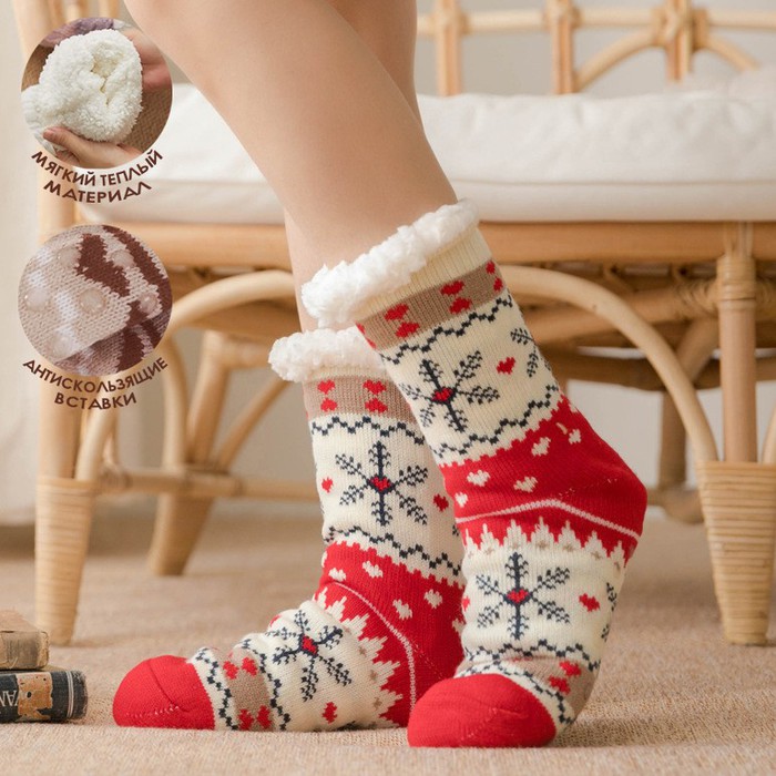 Носки женские высокие окутают Ваши ножки необыкновенной теплотой и уютом. Они очень мягкие внутри и имеют меховой отворот.Обладают силиконовыми вставками на подошве против скольжения.Они являются отличной альтернативой домашним тапочкам!, Их можно надевать дома или со свободной обувью в морозы. Носки высокие изготовлены из высококачественной шерсти. Данный материал обладает отличными терморегулирующими свойствами, что позволяет носкам прекрасно сохранять тепло и предотвращать потоотделение ног., Носки без резинки, что обеспечивает комфортную посадку и не оставляют следов на ноге. Это важное преимущество, особенно для тех, у кого чувствительная кожа или проблемы с кровообращением. Теплые носки не только помогут вам сохранить комфорт и тепло в холодную погоду, но и станут прекрасным подарком для близких и друзей.Носки украшены ярким и оригинальным новогодним рисунком, что делает их идеальным подарком на Новый год и Рождество маме, сестре, дочери, подруге, коллега, девушке.Рекомендована стирка при температуре не выше 30 градусов!Размер универсальный 36-41