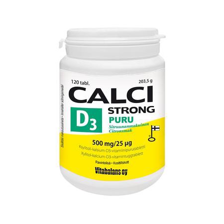 Vitabalans Calci Strong +D3 Puru, Калси Стронг +D3 Пуру, жевательные таблетки со вкусом лимона для восполнения дефицита кальция и витамина D3, 120 шт.Адекватное потребление кальция и витамина D3 важно на всех этапах жизни. Кальций является наиболее важным минералом в скелете и необходим для нормального функционирования костей и зубов. Витамин D способствует нормальному усвоению кальция. Кальций и витамин D также способствуют нормальному функционированию мышц. Препараты Calci Strong увеличили содержание витамина D3 в таблетке до 10 мкг, что улучшает всасывание кальция в кишечнике и его связывание с костной тканью. Препарат рекомендован: - при недостатке молочных продуктов в повседневном рационе; - при диете; - для растущих детей и подростков; - для взрослых; - для пожилых; - для беременных и кормящих мам; - для вегетарианцев и веганов. Суточная доза (1 таблетка) содержит: кальций 500 мг, витамин D3 10-20 мкг. Подсластители - ксилит и сорбит, ароматизатор - лимон. Инструкция по применению. Жуйте по 1 таблетке у раз в день. Биологически активная добавка не заменяет разнообразного и сбалансированного питания и здорового образа жизни.Производитель Финляндия.