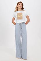 Лёгкие комфортные брюки из трикотажа с добавлением спандекса. Модель с поясом на резинке. Низ изделия обработан плоскими швами. Гладкий материал приятен к телу, не теряет форму и позволяет коже дышать.