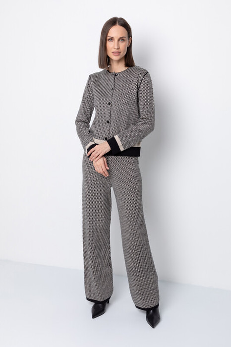 Удобные вязаные брюки прямого силуэта. Связаны жаккардом из мягкой полушерстяной пряжи. В составе 50% шерсти и 50% акрила. Шерсть в составе сохраняет тепло, а благодаря волокнам акрила изделие мягкое и дольше сохраняет форму. Пояс на резинке, регулируется вязаным шнуром в тон брюк. Плотная фактура вязания согревает и сохраняет форму во время носки.