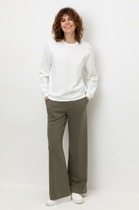 Брюки свободного силуэта со стрелками из мягкого двухцветного футера. Внутренняя сторона изделия представлена в натуральном цвете хлопка, внешняя в нежно-розовом. За счет использования крашенной пряжи, данный вид полотна прошел минимальную обработку, что придало изделию мягкость и шелковистость.
