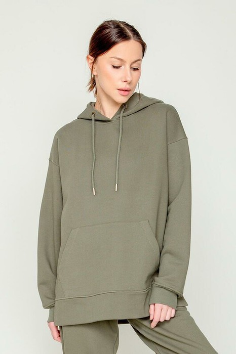 Трикотажная толстовка-оверсайз из петельчатого футера трехнитки. Капюшон регулируется с помощью шнура. У изделия свободная посадка, карман-кенгуру, эластичные манжеты. По бокам разрезы. Гладкий и плотный материал на основе хлопка сохраняет форму.