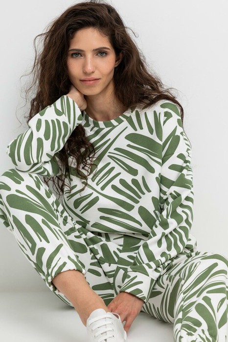 Мягкая женская  толстовка из набивного футера трехнитки.  Спущенные рукава и манжеты  добавляют объем.
