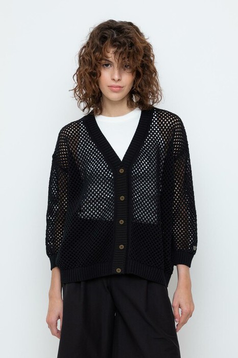 Укороченный вязаный ажурный кардиган на пуговицах. Состав 50% хлопок, 50% акрил. Благодаря акрилу в составе изделие не пилингуется.