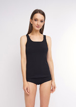 Базовым элементом гардероба является топ из эластичного трикотажа в рубчик. Широкое плечо и высокий вырез делают изделие комфортным и универсальным в носке.