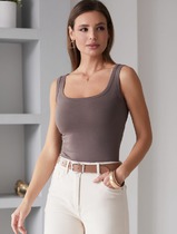 Базовым элементом гардероба является топ из эластичного трикотажа в рубчик. Широкое плечо и высокий вырез делают изделие комфортным и универсальным в носке.