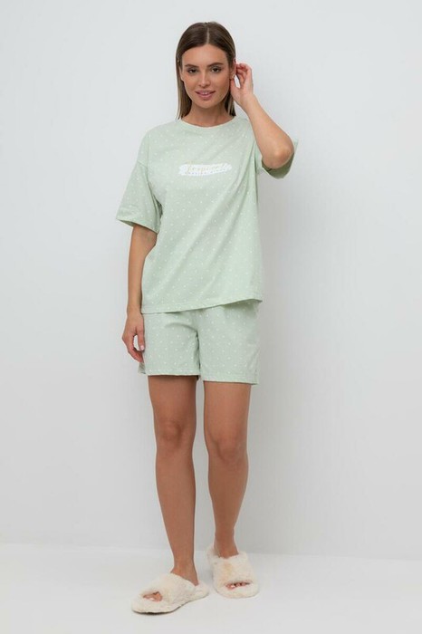 Комплект для комфортного сна и отдыха из трикотажа с нежным рисунком из 100% натурального хлопка. Футболка с короткими рукавами и спущенной линией плеча комфортно садится по фигуре. Шорты с мягким поясом на резинке. В поясе шорт атласная лента. Свободный силуэт не сковывает движения.