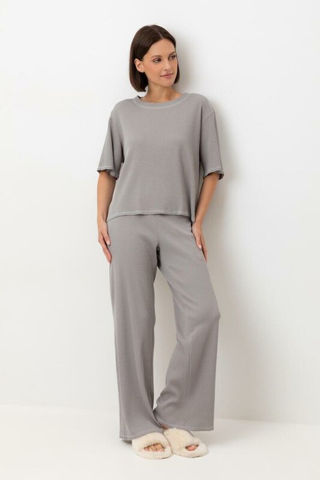 Комплект из объемного трикотажа с добавлением эластичных волокон. Свободный силуэт, мягкий пояс и отсутствие боковых швов на брюках обеспечат комфорт во время сна и отдыха.