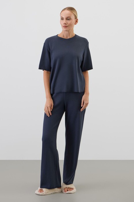Комплект из объемного трикотажа с добавлением эластичных волокон. Свободный силуэт и мягкий пояс брюк обеспечат комфорт во время сна и отдыха.
