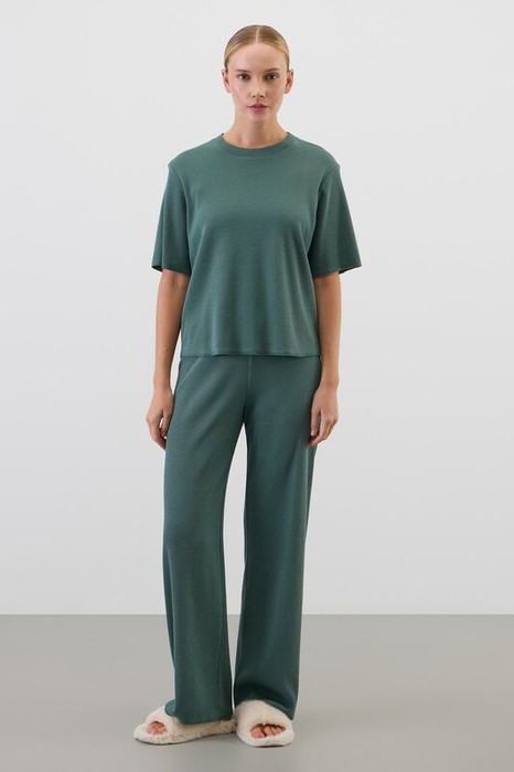 Комплект из объемного трикотажа с добавлением эластичных волокон. Свободный силуэт и мягкий пояс брюк обеспечат комфорт во время сна и отдыха.