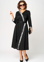 Платье на запах с воротником из плотного набивного трикотажа интерлок. Модель с длинными объемными рукавами. С помощью пояса можно регулировать посадку и силуэт.
