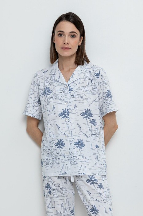 Легкая рубашка с короткими рукавами на пуговицах из набивного  трикотажа.  Гладкий материал приятен к телу и позволяет коже дышать.
