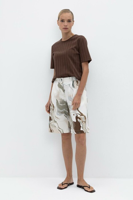 Женские шорты со складками и удобными  карманами из плотного набивного трикотажа интерлок. Низ обработан плоскими швами.