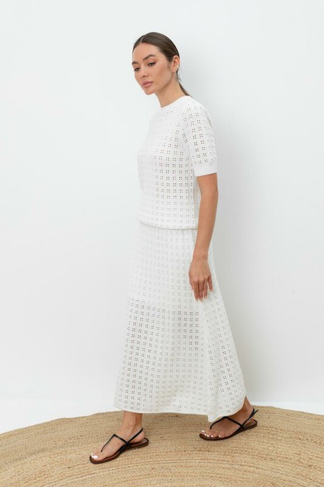 Вязаная ажурная юбка макси с подкладом. Состав 50% хлопок, 50% акрил. Благодаря акрилу в составе изделие не пилингуется.