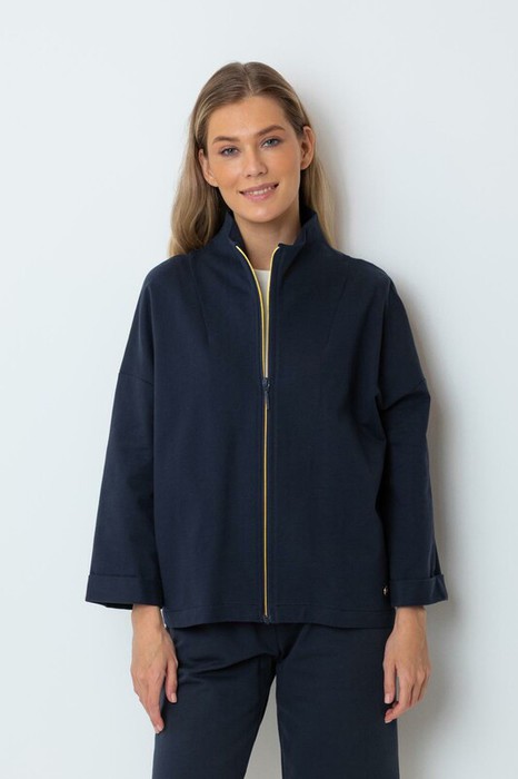 Укороченная трикотажная куртка на молнии с карманами и высоким воротником-стойкой. Произведена из мягкого трикотажного футера с эластаном. Спущенные рукава добавляют объем.