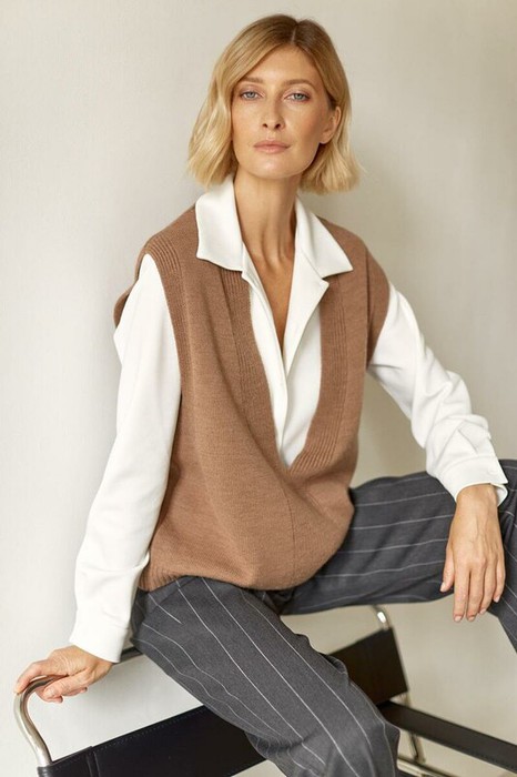 Вязаный жилет с элегантным глубоким вырезом. В составе 50% шерсти и 50% акрила. Шерсть в составе сохраняет тепло, а акрил делает изделие мягким и объемным.