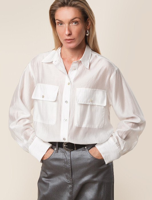 Блузка выполнена из полупрозрачного лиоцелла с эффектом шелка. Праздничная и переливающаяся фактура ткани изыскано играет в вечернем освещении. Легкая и почти невесомая модель, приятно ощущается на теле. Застежка на пуговицы из натурального перламутра, подчеркивает роскошь.