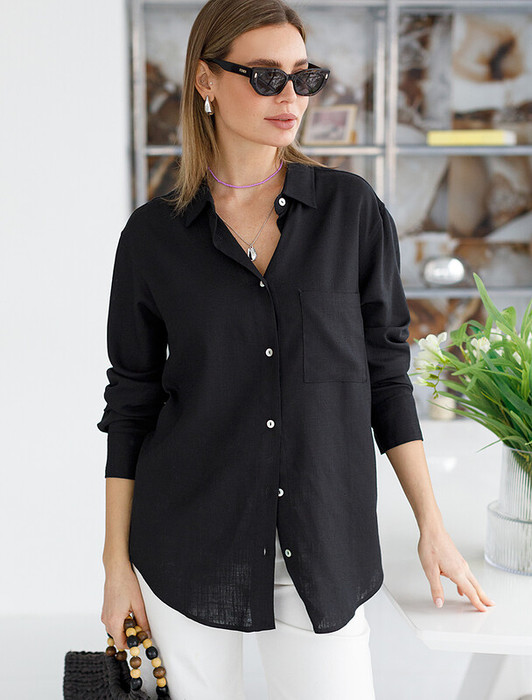 Блузка выполнена изо льна с вискозой. Модель с застежкой на пуговицы из натурального перламутра дополнена сольным карманом. Сочетается в костюме с брюками D24.222 и шортами D28.052. Ткань изящно струится, почти не мнется и сохраняет форму в течении долгого времени, обладает высокой воздухопроницаемостью, обеспечивая комфорт даже в самое жаркое время года.