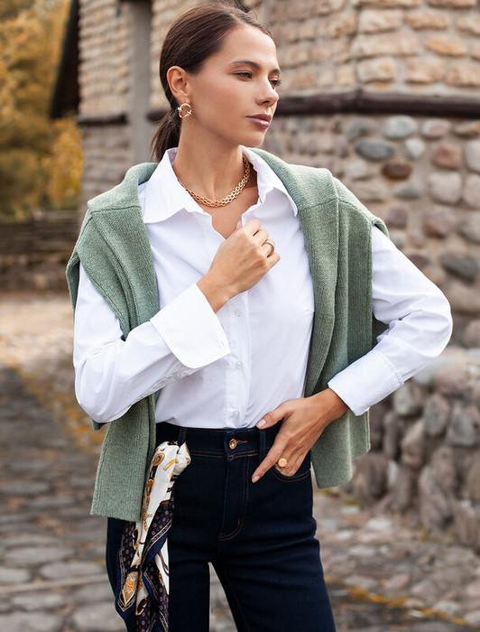 Блузка полуприталенного силуэта выполнена из эластичного хлопка. Особое внимание рукавам придают длинные манжеты – декоративный и функциональный элемент. Застежка на перламутровые пуговицы. Совет стилиста: используйте блузку в комплекте с джинсами прямого кроя, чтобы создать городской расслабленный образ. В паре с цветными брюками, на контрасте или в классическом черном сочетании, с жакетом.