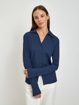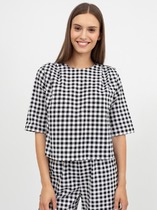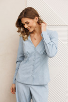 Свободный крой блузки и спущенная линия плеча  дарят ощущение легкости и непринужденности, делая образ одновременно женственным и современным. Широкие рукава средней длины гармонично дополняют образ и идеально подходят для полных рук, обеспечивая комфорт, свободу движений и уверенность. Аккуратная застежка на маленькую пуговицу добавляет утонченности, а круглый вырез красиво обрамляет шею, создавая аккуратную линию декольте.