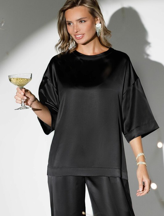 Vilatte Блузка свободная из струящегося плотного сатина D29.279 черный
