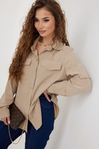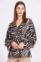 Свободный крой блузки и спущенная линия плеча дарят ощущение легкости и непринужденности, делая образ одновременно женственным и современным. Широкие рукава средней длины гармонично дополняют образ и идеально подходят для полных рук, обеспечивая комфорт, свободу движений и уверенность. Аккуратная застежка на маленькую пуговицу добавляет утонченности, а круглый вырез красиво обрамляет шею, создавая аккуратную линию декольте.