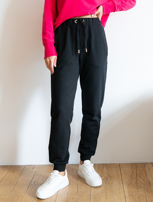 Черные брюки джогерры выполнены из эластичного футера двухнитки. Модель дополнена двумя карманами и поясом с регулируемым шнурком. В завершённый образ возьмите свитшот D49.945, D49.948 или свободное худи.